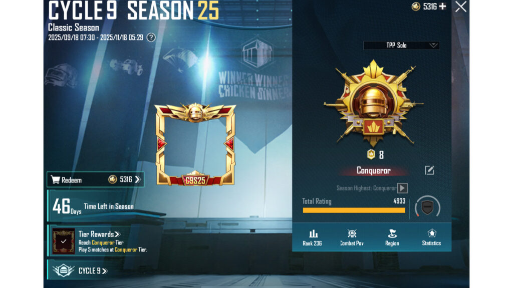 Mujhe Solo TPP me Conqueror reach karne me lagbhag 15–18 din lage. Main daily 16–18 matches khelta tha aur average 120–160 points gain karta tha.