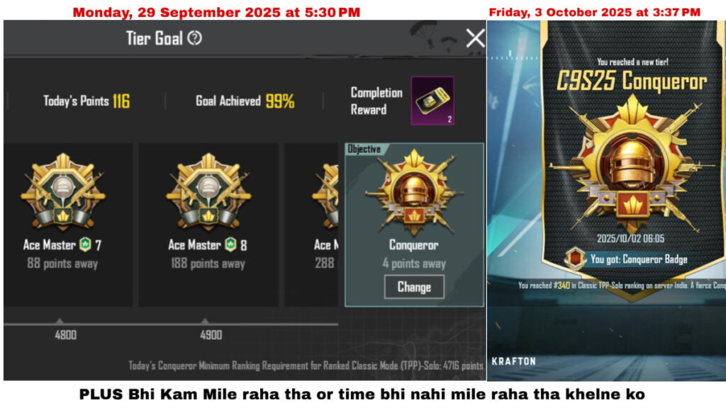 Agar aap early season me push karte ho aur daily consistent points lete ho, to 4 se 15 din me Conqueror achieve kiya ja sakta hai.